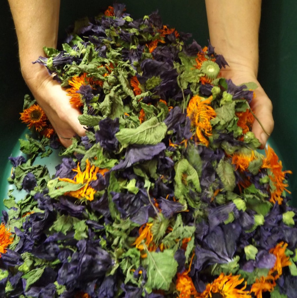 On y trouve une quinzaine de plantes différentes, auxquelles s'ajoutent quelques unes cueillies directement dans la nature dans le respect des sites et de la biodiversité. Toutes les plantes, de culture ou de cueillette sont labellisées en Agriculture Biologique.